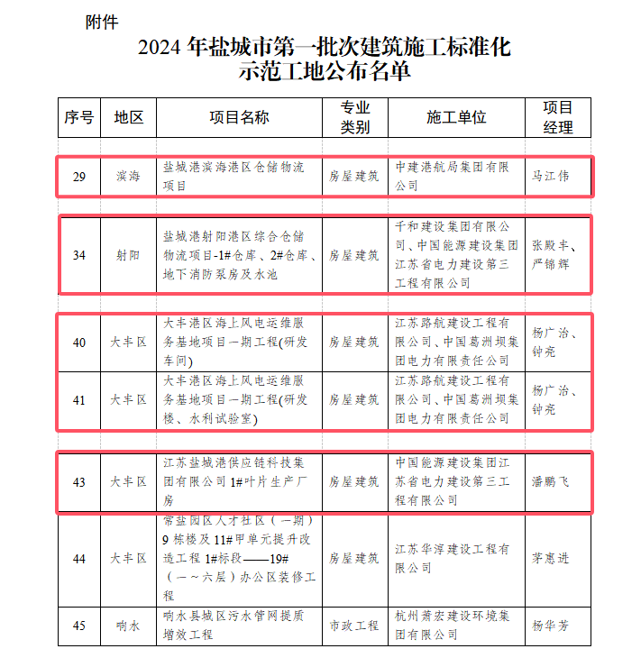 近日,市住房和城鄉(xiāng)建設(shè)局公布了2024年第一批次鹽城市建筑施工標準化示范工地項目名單,江蘇鹽城港項目管理咨詢有限公司代管項目:鹽城港濱海港區(qū)倉儲物流項目,鹽城港射陽港區(qū)綜合倉儲物流項目1#倉庫、2#倉庫、地下消防泵房及水池,大豐港區(qū)海上風電運維服務(wù)基地項目一期工程(研發(fā)車間、研發(fā)樓、水利試驗室),大豐港區(qū)海上風機葉片制造基地項目(一期)項目獲評2024年第一批次鹽城市建筑施工標準化“示范工地”。