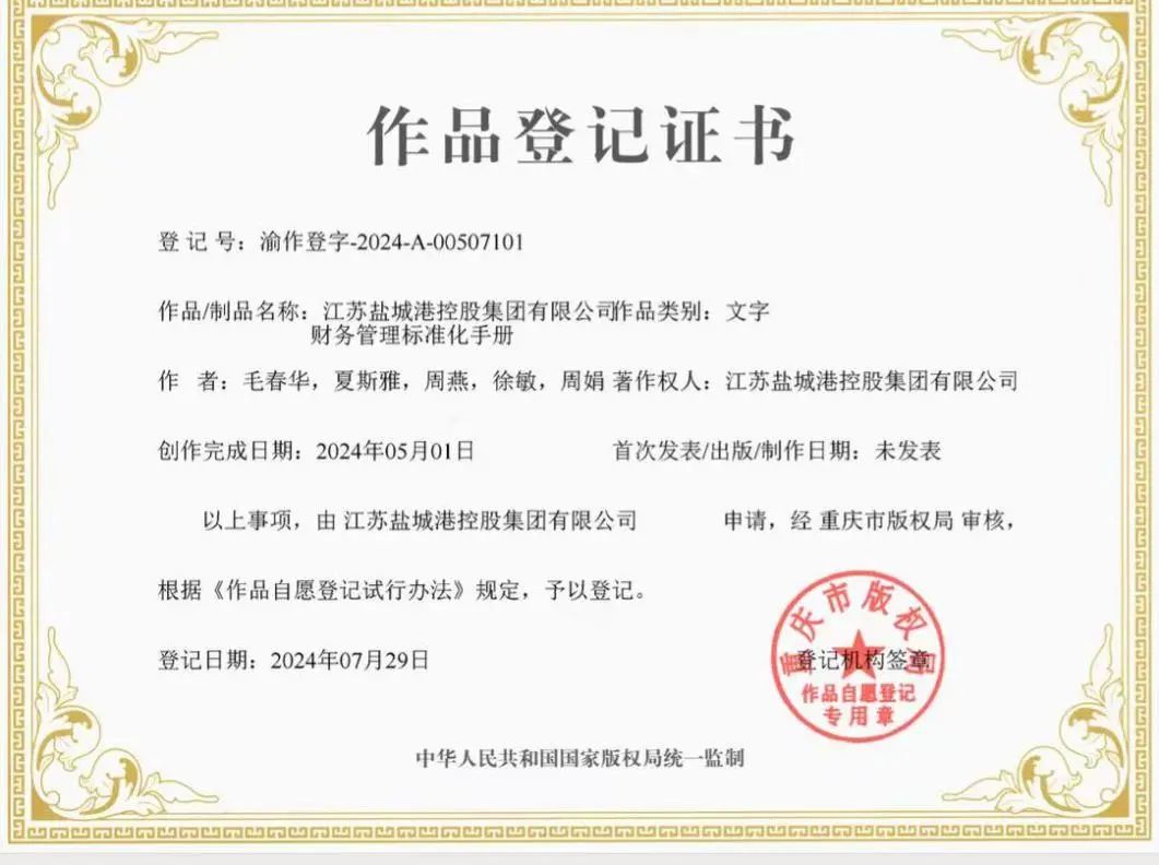 近日,鹽城港集團(tuán)自主編制的《財(cái)務(wù)管理標(biāo)準(zhǔn)化手冊(cè)》經(jīng)過(guò)嚴(yán)格審核與認(rèn)證,成功取得了由國(guó)家版權(quán)局頒發(fā)的作品登記證書。這不僅是集團(tuán)在財(cái)務(wù)精細(xì)化管理方面的積極探索,也是集團(tuán)對(duì)財(cái)務(wù)管理標(biāo)準(zhǔn)化的創(chuàng)新實(shí)踐。