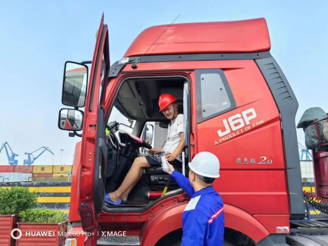 雖已入秋,碼頭高溫不減。一輛輛卡車排列在碼頭,靜靜等待土石裝卸運(yùn)輸指令,卡車司機(jī)也一同經(jīng)歷著高溫的考驗(yàn)。為確保卡車司機(jī)們的安全與健康,保障運(yùn)輸不斷檔,港區(qū)派專人為司機(jī)送去礦泉水等清涼物資,并叮囑他們行車前要仔細(xì)檢查車況,注意駕駛安全,預(yù)防高溫中暑和各類安全事故發(fā)生。貨車司機(jī)們紛紛表示,這樣的關(guān)懷讓他們感受到了絲絲涼意和滿滿溫情。