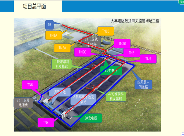 該項目陸域用地面積25.03萬㎡,其南北向縱深約736.83米,東西向?qū)挾葎t約為318.97米。作為大豐港區(qū)重點工程的一部分,該項目從二期散貨堆場已建的T6轉(zhuǎn)運站預(yù)留的2路皮帶機接口延伸而來,旨在通過T6轉(zhuǎn)運站皮帶機的延伸及大豐港現(xiàn)有臨時堆場用地范圍內(nèi)相應(yīng)配套設(shè)施的建設(shè),進一步提升港口的功能性和效率。