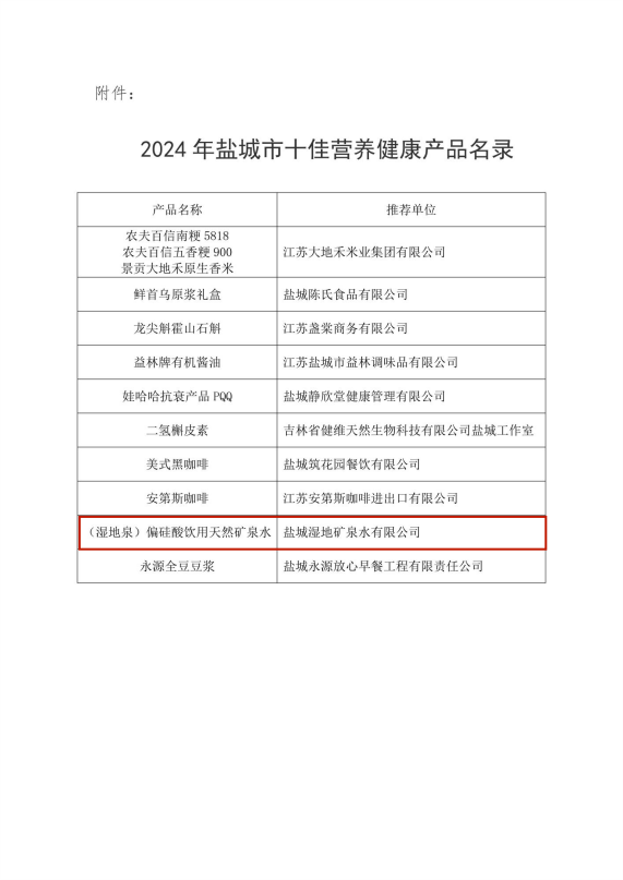 近日,鹽城市十佳營(yíng)養(yǎng)健康產(chǎn)品評(píng)選結(jié)果出爐,鹽城濕地礦泉水有限公司“濕地泉”系列偏硅酸飲用天然礦泉水榮獲2024年鹽城市十佳營(yíng)養(yǎng)健康產(chǎn)品稱(chēng)號(hào)。