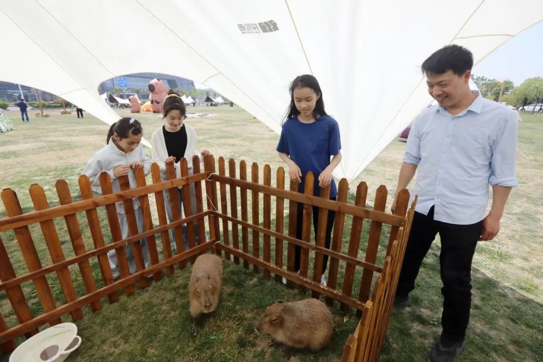 現(xiàn)場(chǎng)的BBQ派對(duì)香氣四溢,烤肉的滋滋聲讓人們沉浸在美食的歡樂中。幾只憨態(tài)可掬的“卡皮巴拉”成為露營(yíng)區(qū)最受歡迎的“特邀嘉賓”。這些溫順的小家伙或悠閑踱步,或慵懶曬太陽,引得游客紛紛駐足互動(dòng)。“沒想到露營(yíng)還能遇到這么可愛的動(dòng)物,孩子都舍不得走了!”帶著孩子參加活動(dòng)的王女士笑著說。一旁的兒童樂園里,孩子們?cè)谲E蹺板、攀爬架、小馬搖樂等游樂設(shè)施上盡情玩耍,歡聲笑語不斷,真正實(shí)現(xiàn)了 “熊孩子放電,解放爸媽雙手”。