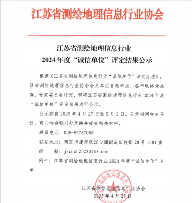 近日,江蘇省測繪地理信息協(xié)會正式發(fā)布2024年度行業(yè)"誠信單位"評選結(jié)果,鹽城港港航勘測設(shè)計有限公司憑借卓越的誠信經(jīng)營表現(xiàn)和專業(yè)技術(shù)實力,成功獲評此項殊榮,不僅是對企業(yè)誠信體系建設(shè)的高度認可,更是對其在測繪地理信息領(lǐng)域?qū)I(yè)能力和服務(wù)質(zhì)量的全面肯定。