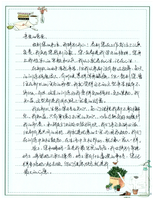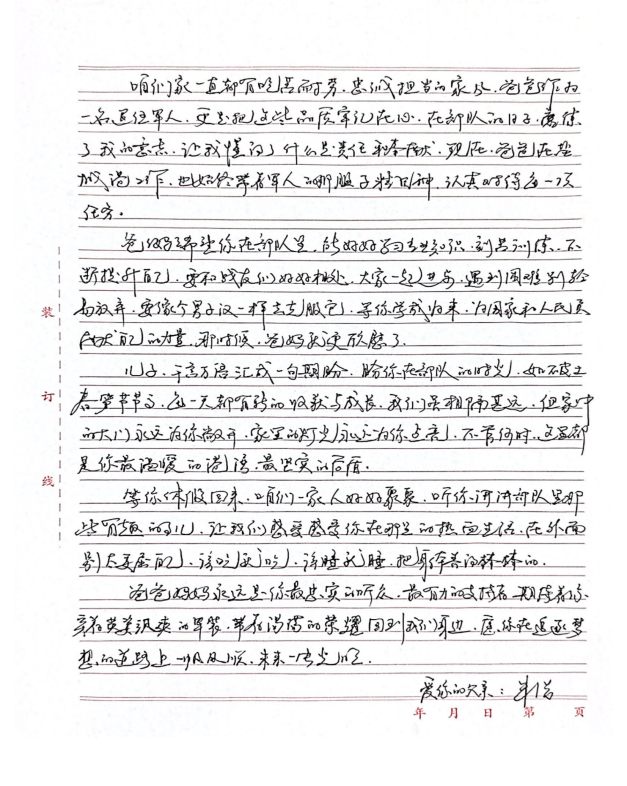 字里行間流露出對雙親的敬仰之情,細(xì)數(shù)在軍旅或職場中的成長點滴,并鄭重承諾將“忠誠、奮進”的家風(fēng)薪火相傳,以實際行動回饋家庭與社會,同時深切期盼家庭團聚的美好時光。