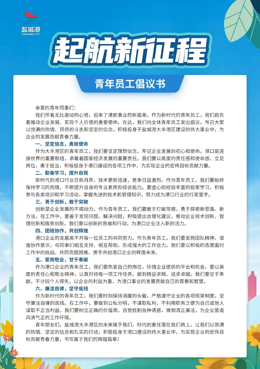 深入機(jī)關(guān)、碼頭一線、項(xiàng)目建設(shè)現(xiàn)場(chǎng),發(fā)放《起航新征程——青年員工倡議書》200余份,號(hào)召廣大青年,以飽滿的熱情、昂揚(yáng)的斗志和堅(jiān)定的信念,積極投身于鹽城港大豐港區(qū)建設(shè)的偉大事業(yè)中,為億噸大港建設(shè)貢獻(xiàn)青春力量。