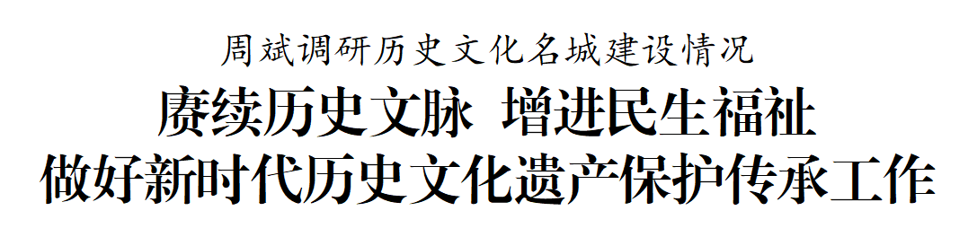 周斌在調研時強調,歷史是城市的記憶,文化是城市的靈魂。各地各部門要堅定文化自信,堅持守正創新,自覺扛起歷史文化遺產保護傳承的政治責任,以繡花功夫守護歷史文化遺產、延續鹽城文脈,開創新時代歷史文化遺產保護傳承工作新局面。要正確處理好傳統與現代、保護與發展的辯證關系,充分挖掘利用歷史文化遺產的多重價值,以改革創新精神推動歷史文化遺產創造性轉化、創新性發展。