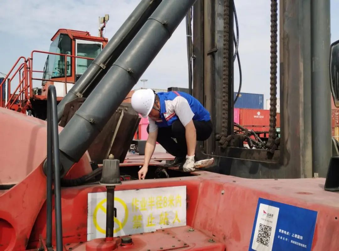 在今年4月初,大豐港區的一臺卡爾瑪堆高機因為電氣故障拋錨,嚴重影響了正常的生產。港區維修人員第一時間聯系售后單位,售后人員通過電話指導排查故障點,卻遲遲不能找到原因,唯有進行現場檢查排故。當時上海疫情嚴重,售后人員需要層層報備、審批、隔離后才能到達現場,漫長的等待期將嚴重影響集裝箱的正常作業進度。此時現場維修人員打電話給倪旅軍同志咨詢其他故障時,偶然提到了這臺機的問題,倪旅軍同志知曉后立即驅車前往集裝箱堆場了解故障情況。經過短短20分鐘的現場排查,他成功找到并解決了堆高機的故障,使之能夠正常作業。