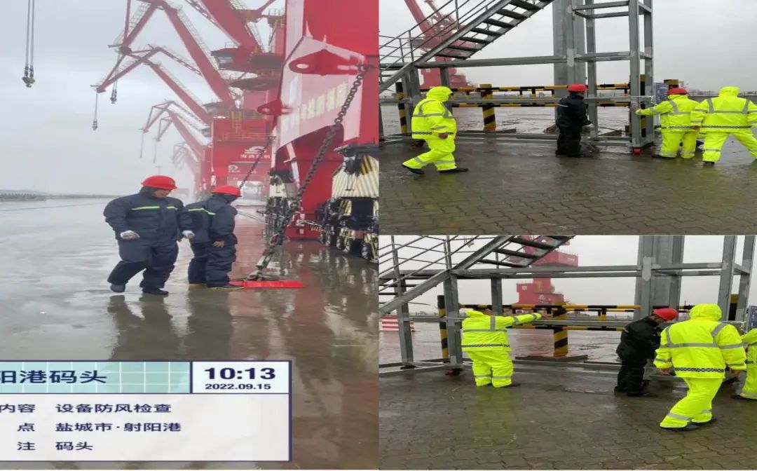 射陽港風電公司第一時間停止碼頭作業,并加大對碼頭面的檢查力度,逐臺檢查設備防風裝置的完好性,加固門機錨定,及時整改現場檢查發現的問題,時刻做好應戰準備。