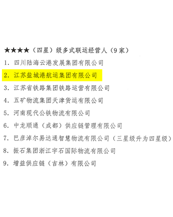近日,中國集裝箱行業協會發布第五批多式聯運經營人等級評估結果,歷經資料審查、專家評審等多環節嚴格考核,江蘇鹽城港航運集團有限公司(以下簡稱“航運集團”)憑借卓越的綜合實力和服務水平,成功獲評“四星級多式聯運經營人”稱號。