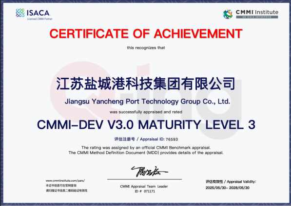 從平臺建設、資質認證、人才培育多維度搭建創新支撐體系,為科技創新筑牢根基。成功獲批“鹽城市智慧港口智能監管系統工程技術研究中心”,通過CMMI三級、ITSS三級信息技術服務標準符合性認證,構建專業化、規范化的技術研發與服務框架;港機公司緊跟步伐,成功入選江蘇省創新型中小企業、鹽城市高新技術企業培育庫,順利通過環境管理體系、質量管理體系等認證,資質體系不斷完善。新增4本系統集成項目管理工程師(中級)證書,專業人才隊伍持續壯大,為創新工作提供智力支撐。