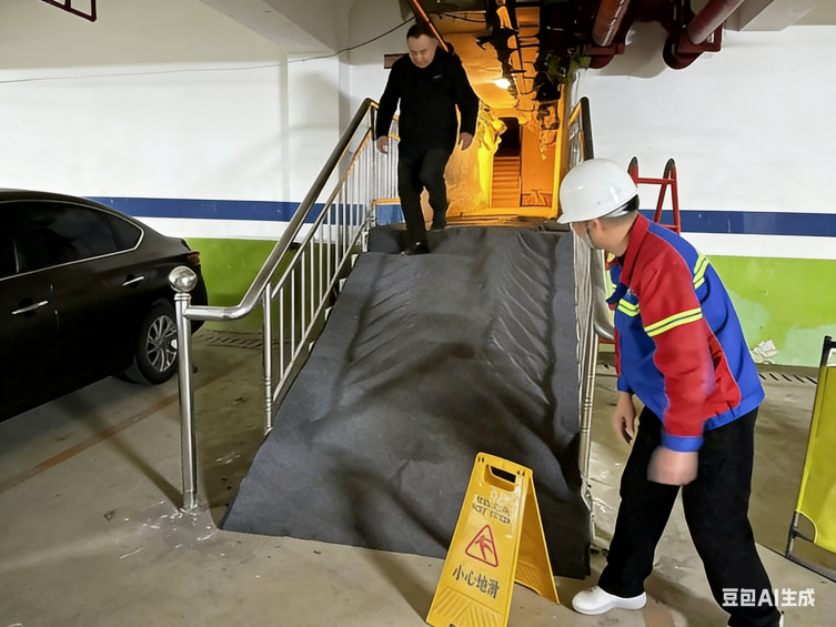 險情就是命令,處置刻不容緩。搶險人員攜專業搶修工具、備用管材火速進場,與現場協調組實現無縫銜接。為防范業主滑倒受傷,工作人員規范鋪設防滑警示帶與防滑地毯,醒目設置安全標識,有序引導人流繞行;搶險組依據消防管網分布圖精準定位閥門,果斷執行分區關閥止水操作,迅速切斷漏水源頭,有效遏制險情進一步蔓延。