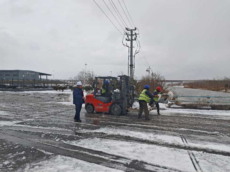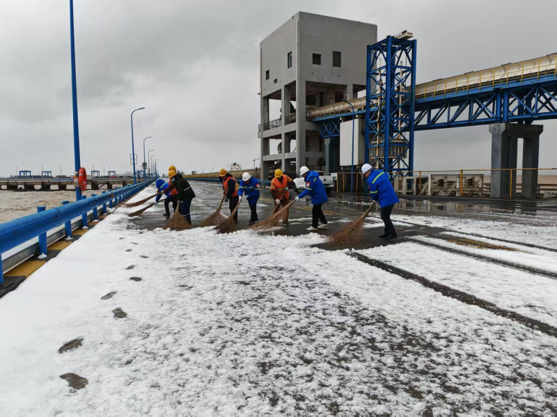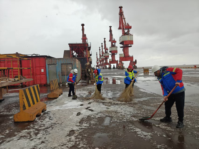 保稅物流中心領(lǐng)導(dǎo)班子靠前指揮,提前備足工業(yè)鹽等防凍融雪物資,組織全體干部職工開(kāi)展鏟雪除冰行動(dòng)。大家不畏嚴(yán)寒、分工有序,重點(diǎn)清掃場(chǎng)區(qū)主干道、物流出入口、停車場(chǎng)等關(guān)鍵區(qū)域,黨員干部沖鋒在前,青年職工奮勇?lián)?dāng),經(jīng)過(guò)數(shù)小時(shí)連續(xù)作業(yè),徹底清除主要通行區(qū)域積雪積冰,有力保障了物流車輛暢通與生產(chǎn)作業(yè)有序運(yùn)行。濱海港區(qū)各單位更是多點(diǎn)發(fā)力,投資公司優(yōu)化作業(yè)流程和行車路線,設(shè)立現(xiàn)場(chǎng)管理員科學(xué)調(diào)度;港務(wù)公司與客戶高效聯(lián)動(dòng),保障貨源供應(yīng)鏈暢通;物流公司聚焦技術(shù)攻堅(jiān)、市場(chǎng)拓展和人才培養(yǎng),在寒冬中積蓄發(fā)展動(dòng)能。