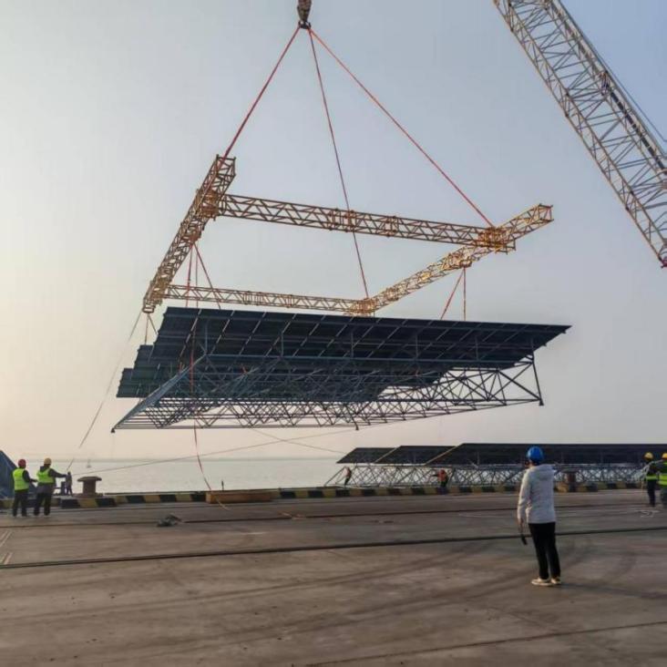 近日,隨著組裝完成的海上光伏模塊平穩吊裝上船,響水港區首次海上光伏板裝船作業圓滿完成。標志著港區在綠色能源物流領域實現全新突破——從一個傳統的“裝卸中轉站”,正式轉型為集“場地租賃、現場組裝、碼頭出運”于一體的新能源裝備“集散中心”,為推動國家“雙碳”目標落地注入港口動能。